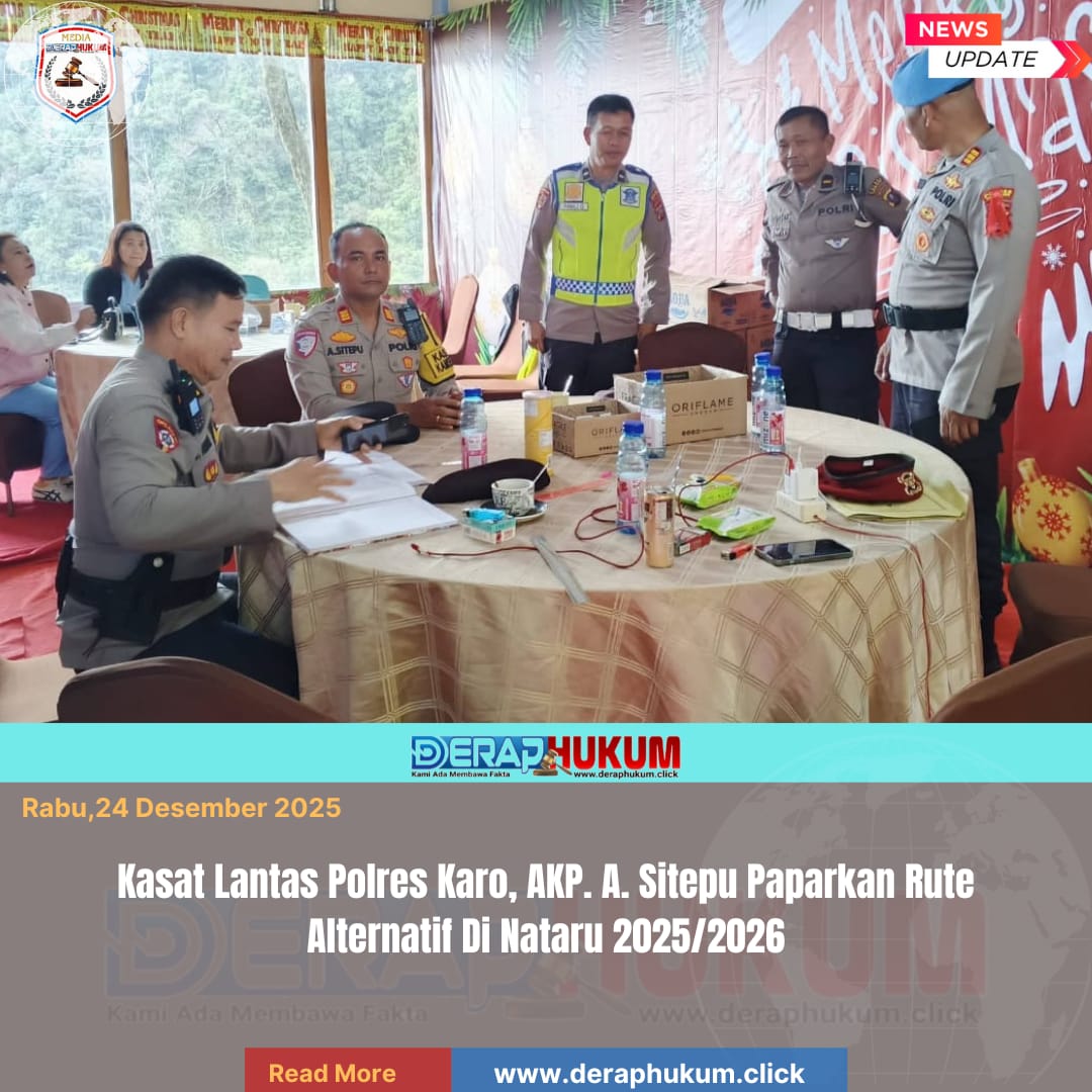 Polres Tanah Karo dalam hal ini melalui Satuan Lalu Lintas (Satlantas) Polres Tanah Karo selaku Kasat Lantas Polres Karo, AKP Andita Sitepu, SH, MH menginformasikan kepada seluruh masyarakat dan pengguna jalan, bahwa menjelang perayaan Natal dan Tahun Baru (Nataru) 2025 – 2026 diperkirakan akan terjadi peningkatan volume arus Lalu Lintas di wilayah Kabupaten Karo dan sekitarnya.