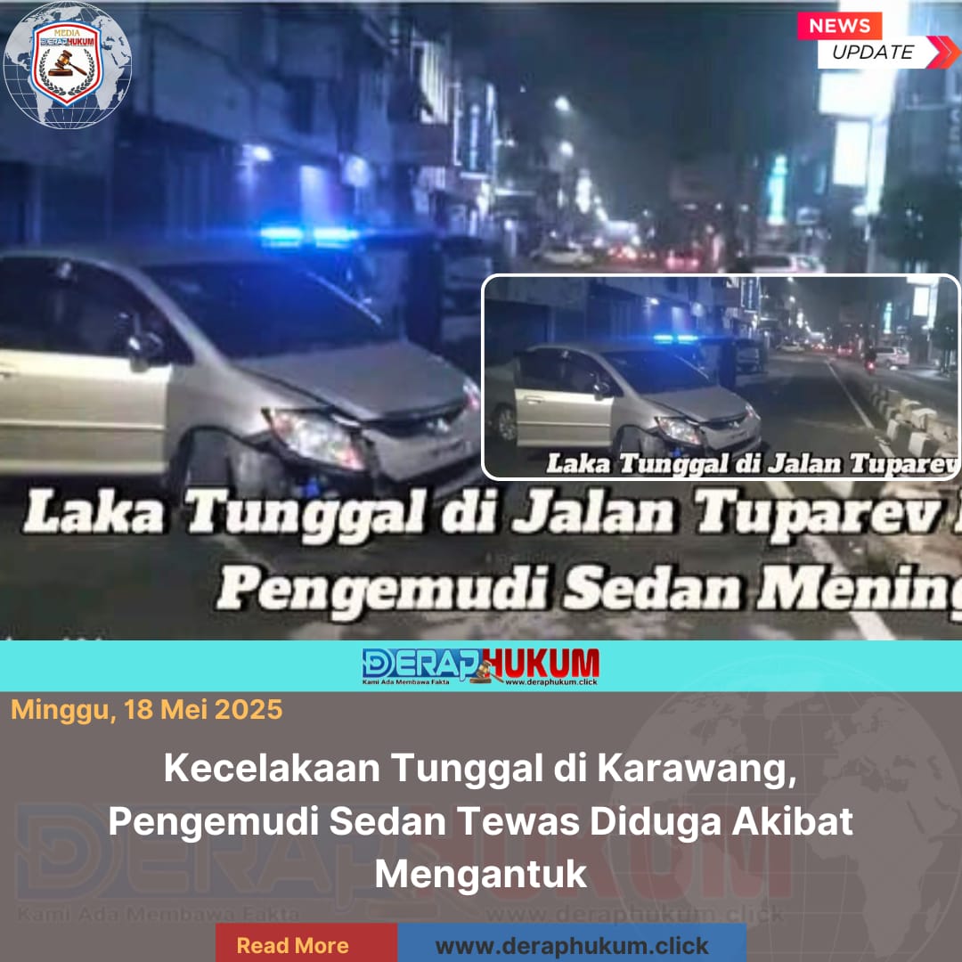Karawang, Jawa Barat | Deraphukum.click | Pada Sabtu subuh (17/5/2025), sebuah kecelakaan tunggal terjadi di Jalan Tuparev, Karawang, tepatnya dekat Gang Bojong arah Pasar Karawang. Sebuah sedan dengan nomor polisi B 8346 O menabrak pembatas jalan. Pengemudi ditemukan meninggal dunia di tempat kejadian oleh anggota Polsek Karawang Kota yang tengah patroli dan hendak salat Subuh.
