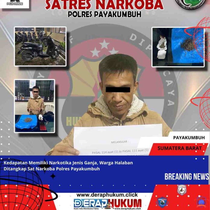 PAYAKUMBUH  | Deraphukum.click | Satuan Reserse Narkotika (Sat Resnarkoba) Polres Payakumbuh berhasil mengamankan seorang warga asal Lareh Sago Halaban YR (46) di sekitaran jalan raya Payakumbuh-Lintau , karena kedapatan memiliki narkotika jenis ganja Kamis (20/02).
