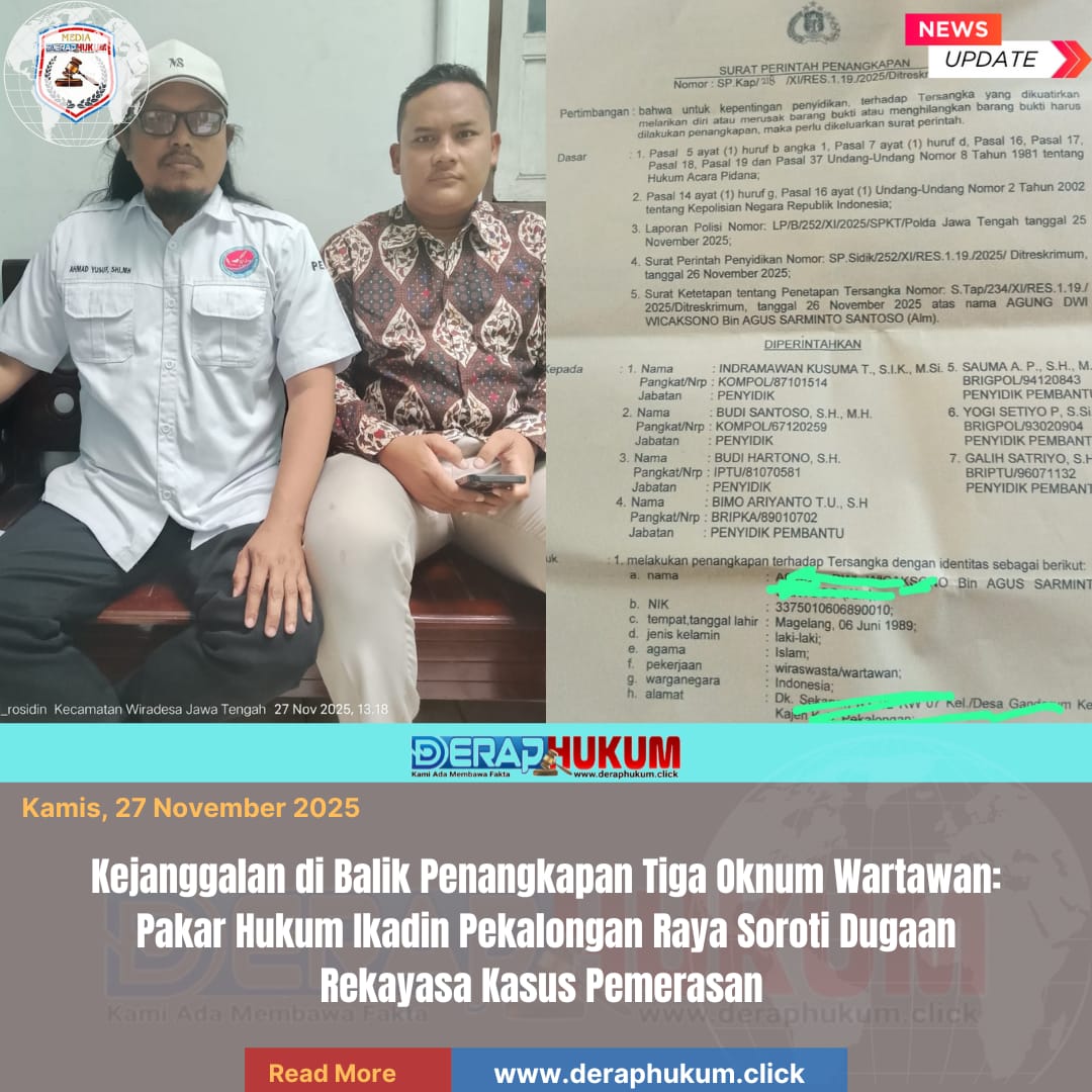 Penangkapan terjadi pada 25 November 2025, sementara surat perintah penangkapan dan penahanan baru dibuat tanggal 26 November 2025. Laporan Polisi tercatat 25 November 2025, pada hari yang sama ketika para wartawan diamankan. Kecepatan proses ini kini menjadi sorotan tajam sejumlah pakar, khususnya dari Ikadin Pekalongan Raya. Menurutnya “Unsur Pasal 368 KUHP Tidak Terpenuhi, Ini Berpotensi Rekayasa”