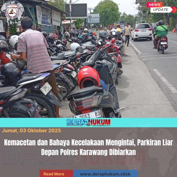 KARAWANG, JAWA BARAT | DerapHukum.click | Fenomena parkiran motor di depan Mapolres Karawang kembali menuai sorotan. Deretan motor yang diparkir di samping kantor polisi, tepatnya di depan deretan warung, terlihat meluber hingga memakan bahu jalan.