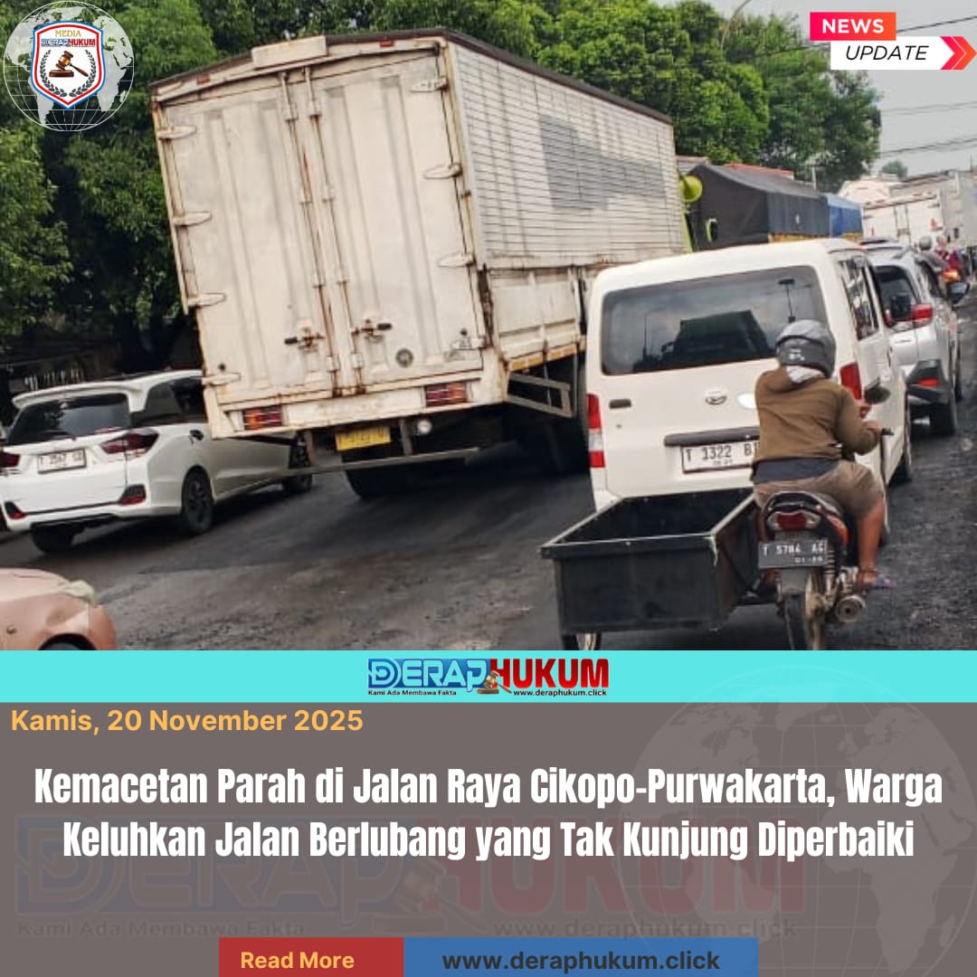 Purwakarta, Jawa Barat | DerapHukum.click | Kamis, 20 November 2025 Kemacetan panjang kembali terjadi di Jalan Raya Cikopo–Purwakarta pada Rabu siang. Deretan kendaraan mengular hingga beberapa kilometer, mulai dari truk besar, pikap, mobil pribadi, hingga sepeda motor yang nyaris tidak dapat bergerak. Turunnya hujan turut memperburuk keadaan, karena lubang-lubang di badan jalan terisi air dan sulit terlihat oleh pengendara.