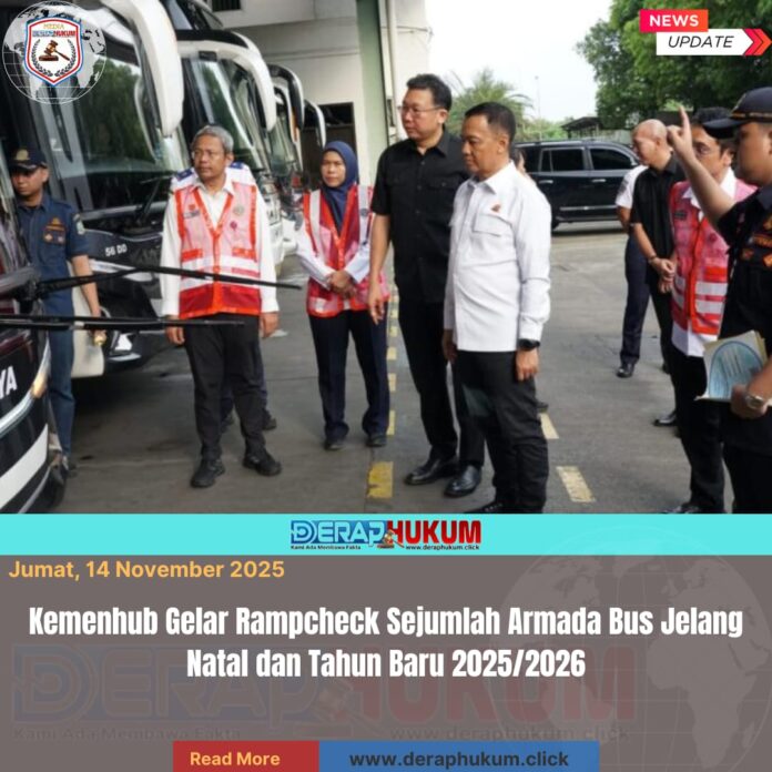 Bekasi, Jawa Barat | Deraphukum.click | Menjelang masa angkutan Natal dan Tahun Baru (Nataru) 2025/2026, Direktorat Jenderal Perhubungan Darat (Ditjen Hubdat) Kementerian Perhubungan melakukan inspeksi keselamatan atau rampcheck sejumlah armada bus di Pool PO Sinar Jaya, Bekasi, Jawa Barat.