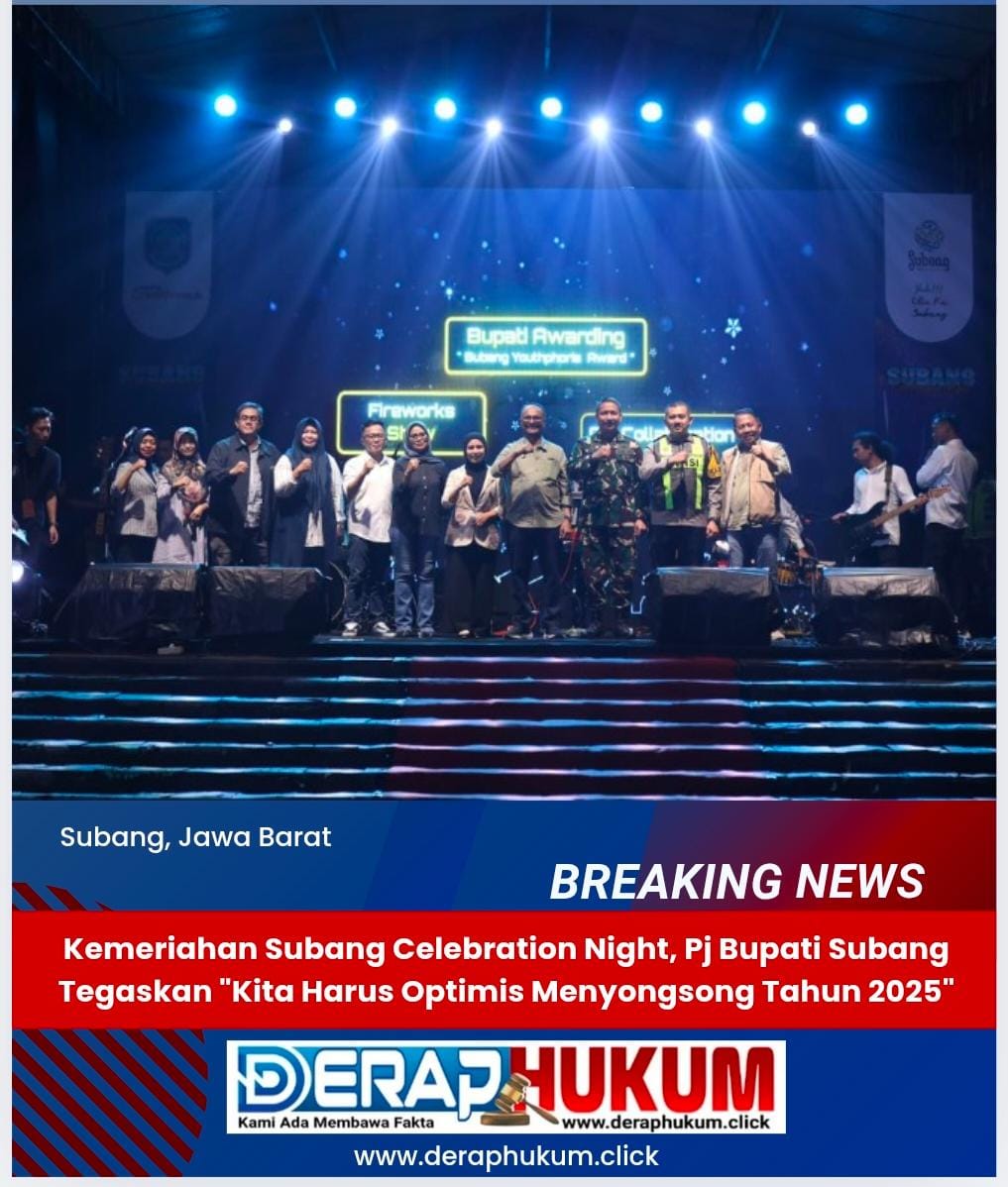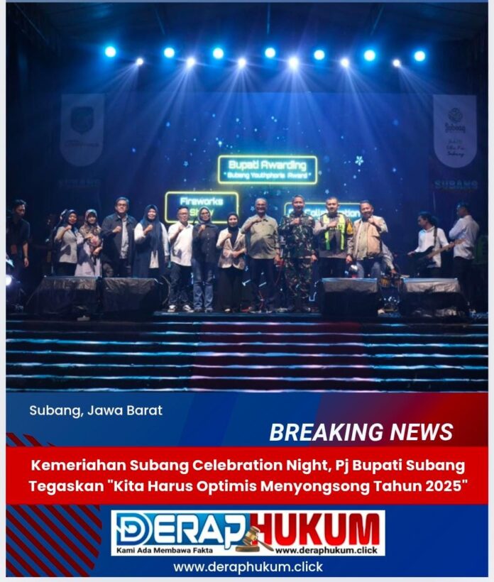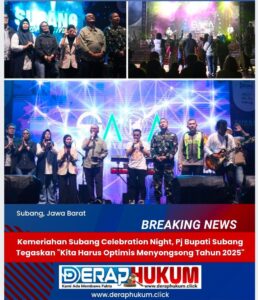 SUBANG | Deraphukum.click | enjabat (Pj.) Bupati Subang, Dr. Drs. Imran, M.Si., MA.Cd., didampingi Pj. Ketua TP PKK Kabupaten Subang, Ny. Rosnelly, M.Si., MA.Cd., menghadiri acara Subang Celebration Night yang berlangsung di Alun-alun Subang pada Selasa, 31 Desember 2024.