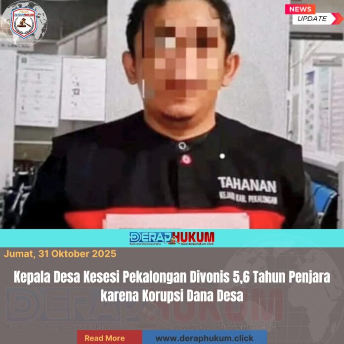Pekalongan, Jawa Tengah | DerapHukum.click | Majelis Hakim Pengadilan Negeri (PN) Pekalongan menjatuhkan vonis 5 tahun 6 bulan penjara kepada Kepala Desa Kesesi, Kecamatan Kesesi, Kabupaten Pekalongan, yang terbukti melakukan tindak pidana korupsi dana desa.