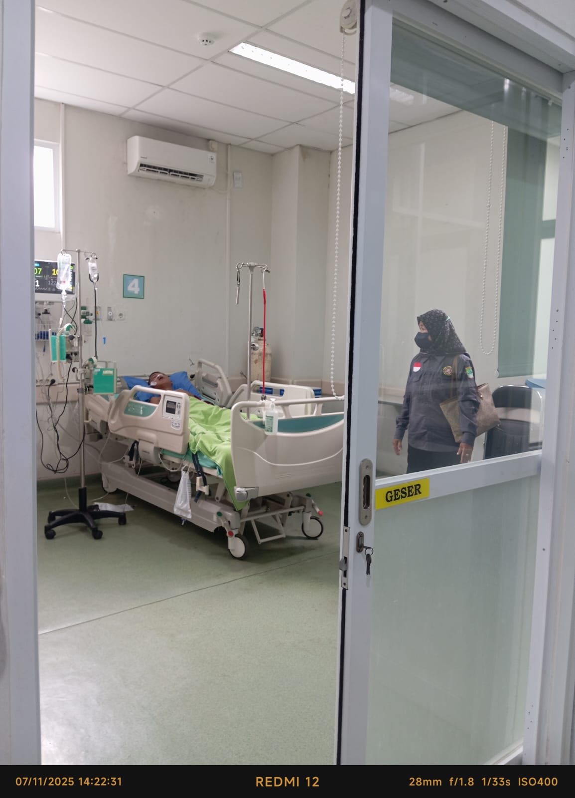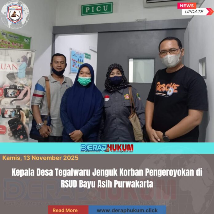 KARAWANG, JAWA BARAT | Deraphukum.click | Kepala Desa Tegalwaru, Kecamatan Cilamaya Wetan, Kabupaten Karawang, Euis bersama sejumlah pihak sosial dari Karawang, menjenguk korban pengeroyokan yang tengah dirawat di RSUD Bayu Asih Purwakarta, pada Jumat (7/11/2025) siang.