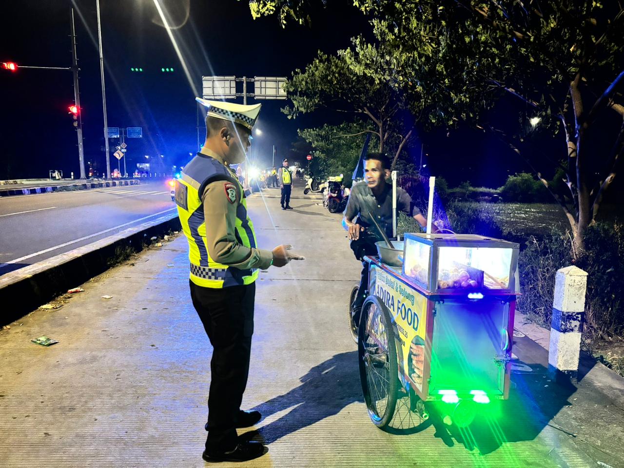 “Edukasi secara humanis kami berikan kepada para pedagang dan muda-mudi di sepanjang jalur Exit Tol Setono, karena potensi kerumunan dapat mengganggu kelancaran arus lalu lintas,” ujar Ipda Sukendro.