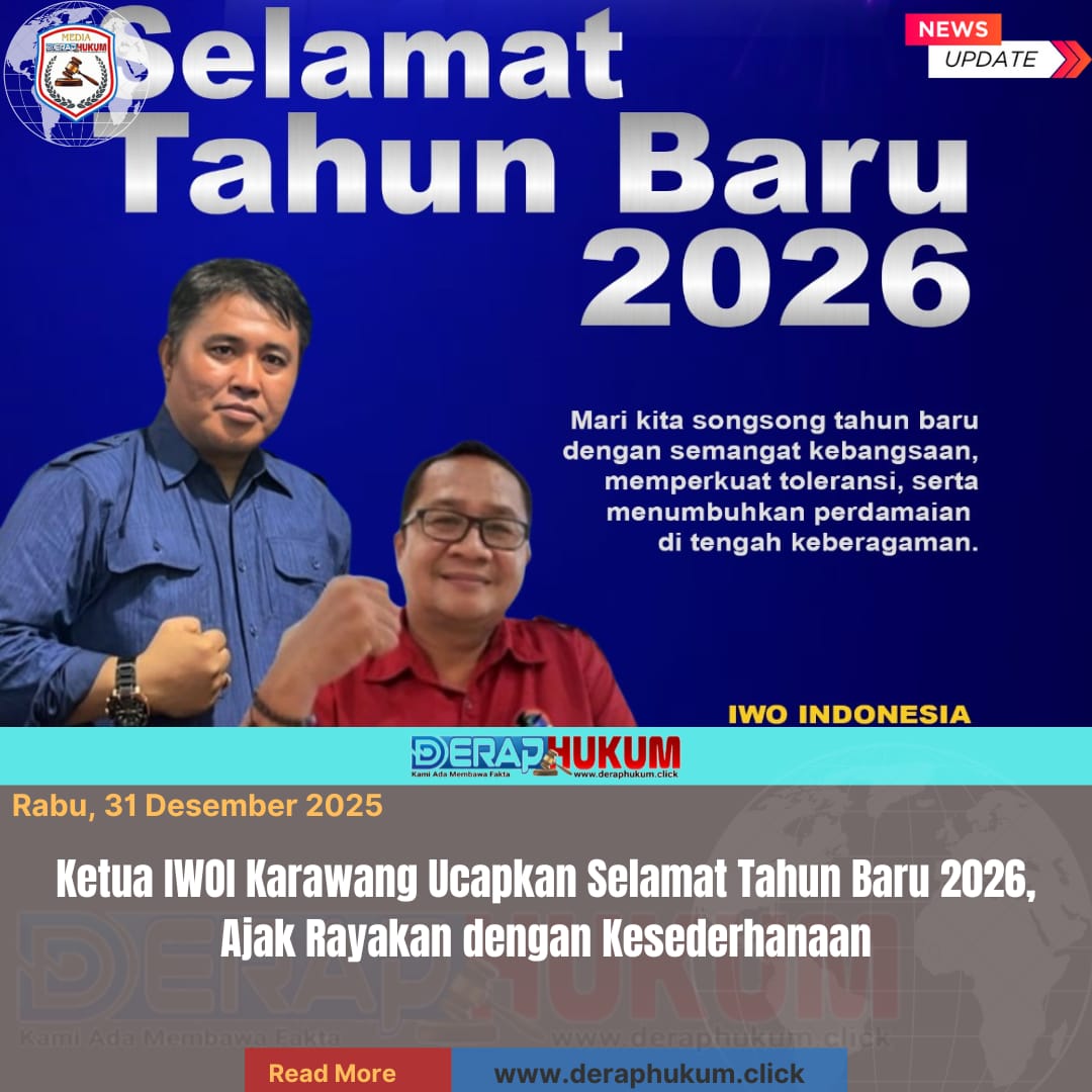 KARAWANG, Jawa Barat | DerapHukum.click | Ketua Ikatan Wartawan Online Indonesia (IWO Indonesia) Dewan Pimpinan Daerah (DPD) Kabupaten Karawang, Syuhada Wisastra, menyampaikan ucapan Selamat Tahun Baru 2026 kepada seluruh pengurus dan anggota IWO Indonesia, sekaligus menyampaikan apresiasi kepada berbagai pihak yang telah mendukung kerja-kerja jurnalistik sepanjang tahun 2025.
