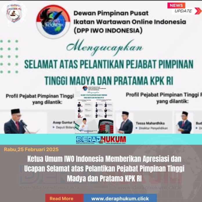 Indramayu,Jawa Barat | Deraphukum.click | 20 Februari 2026 – Ketua Umum Ikatan Wartawan Online (IWO) Indonesia memberikan apresiasi dan ucapan selamat atas dilantiknya sembilan pejabat strategis di lingkungan Komisi Pemberantasan Korupsi (KPK) Republik Indonesia. Pelantikan yang berlangsung pada rentang waktu 18 dan 20 Februari 2026 ini merupakan langkah krusial dalam penguatan struktur organisasi lembaga antirasuah tersebut.