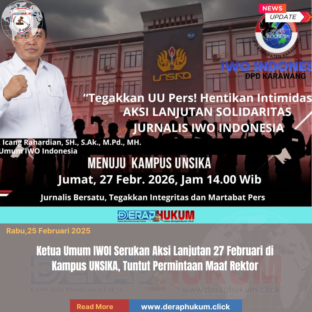 JAKARTA, | Deraphukum.click | Dewan Pimpinan Pusat (DPP) Ikatan Wartawan Online Indonesia (IWOI) resmi mengeluarkan instruksi kepada seluruh jajaran pengurus dan anggota di Indonesia untuk menggelar Aksi Nasional Bela Jurnalis di depan Kampus Universitas Singaperbangsa Karawang (UNSIKA), Jumat, 27 Februari 2026 pukul 14.00 WIB hingga selesai.