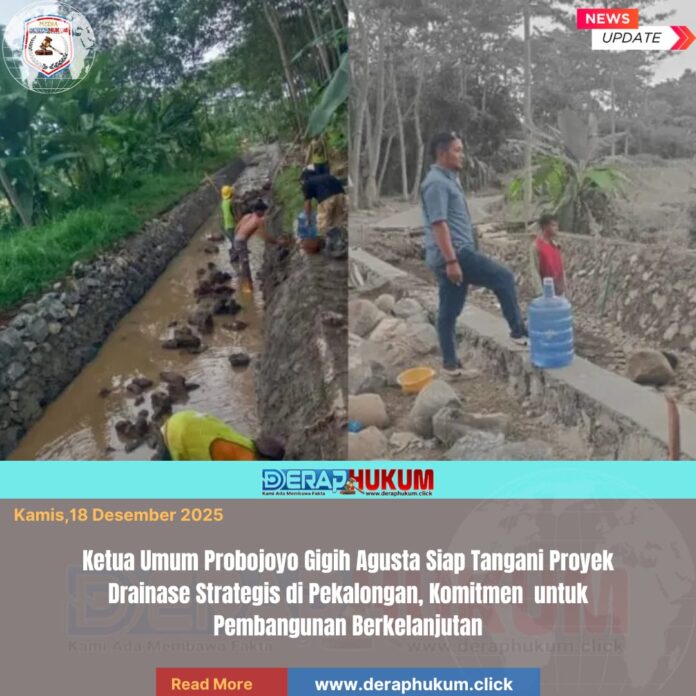 Pekalongan,Jawa Tengah | Deraphukum.click | Dalam langkah nyata mendukung pembangunan infrastruktur yang berbasis pada kebutuhan masyarakat, Ketua Umum Probojoyo, Gigih Agusta, telah resmi diangkat sebagai pelaksana lapangan untuk proyek drainase strategis di beberapa lokasi. Penugasan ini menandakan meningkatnya kepercayaan terhadap Probojoyo dalam meningkatkan kualitas lingkungan hidup melalui pengelolaan air yang baik.( 18/12/ 2025 )