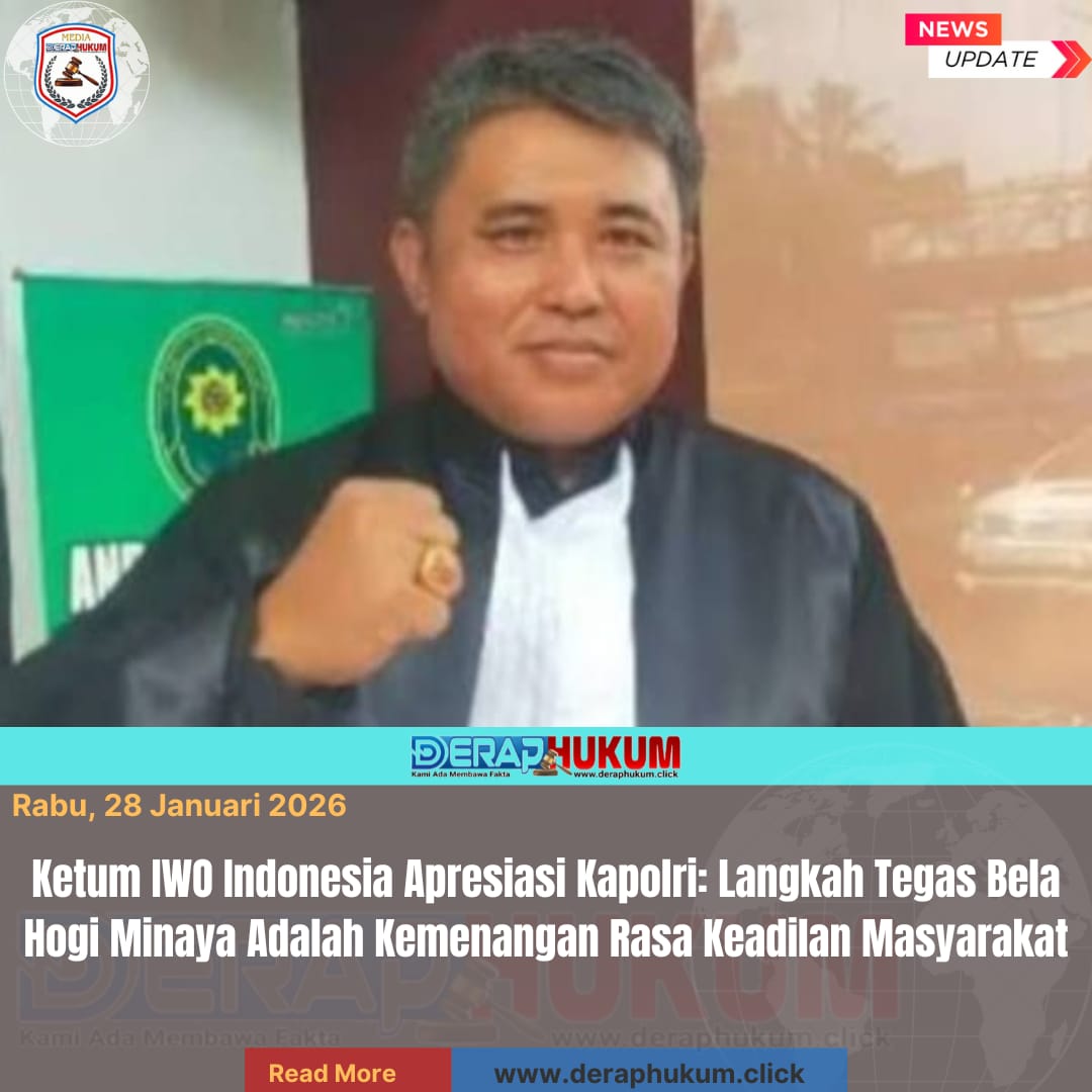 JAKARTA | DerapHukum.click | Ketua Umum IWO Indonesia, Dr. NR. Icang Rahardian, SH., S.Ak., MH., M.Pd, memberikan apresiasi setinggi-tingginya kepada Kapolri Jenderal Listyo Sigit Prabowo atas instruksi tegasnya dalam mengawal kasus Hogi Minaya. Langkah Kapolri yang meminta jajarannya menggunakan hati nurani dinilai sebagai tindakan yang sangat tepat dan progresif.( 28/1/2026).