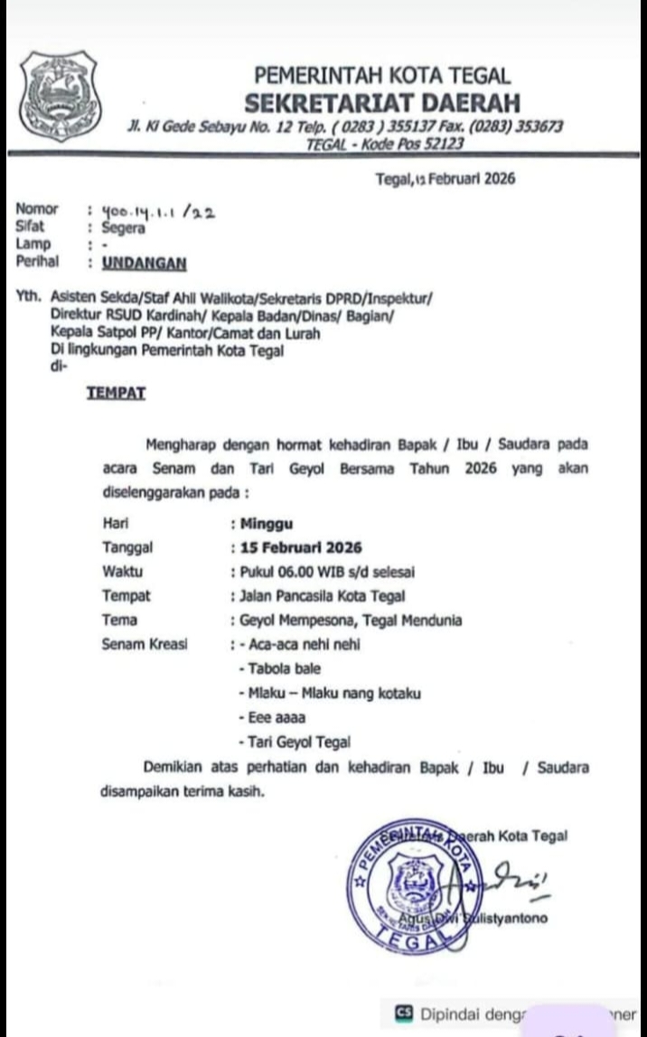 Hebatnya lagi Pemerintah Kota melalui surat yang ditandatangani oleh Sekda Kota Tegal, Agus Dwi Suliastono tertanggal 13 Pebruari 2026 nomor : 400.14.1.1./22 dengan mengundang Asisten Sekda, Staf Ahli Walikota, Sekretaris DPRD, Direktur RSUD Kardinah, Kepala Badan/ Dinas/