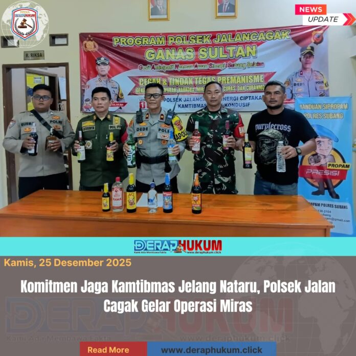 SUBANG, Jawa Barat | DerapHukum.click | Dalam rangka menjaga situasi keamanan dan ketertiban masyarakat (kamtibmas) tetap aman dan kondusif menjelang perayaan Natal dan Tahun Baru (Nataru) 2026, Polsek Jalan Cagak Polres Subang berkolaborasi dengan Forkopimcam Jalan Cagak menggelar operasi gabungan pemberantasan peredaran minuman keras (miras), Rabu (24/12/2025).