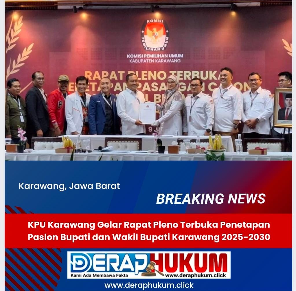 KARAWANG | Deraphukum.click | Komisi Pemilihan Umum Kabupaten Karawang menggelar rapat pleno terbuka penetapkan pasangan calon Bupati dan Wakil Bupati Karawang dengan menetapkan H. Aep Syaepuloh dan H. Maslani sebagai Bupati dan Wakil Bupati Kabupaten Karawang periode 2025-2030, Kamis, (9/01/2025)