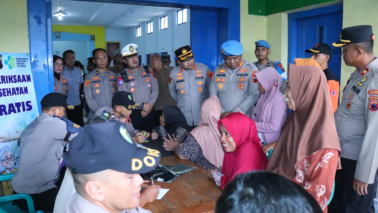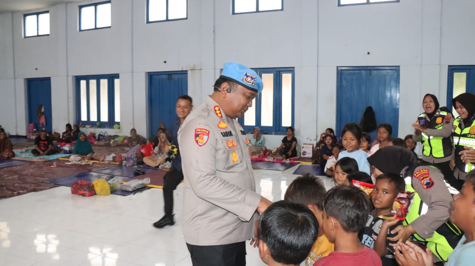 Didampingi Kapolres Pekalongan AKBP Rachmad C. Yusuf, S.I.K., M.Si., Wakapolres, serta petugas Dinkes Kabupaten Pekalongan, Kombes Pol. Saiful Anwar menyapa langsung para pengungsi yang terpaksa meninggalkan rumah mereka akibat banjir yang merendam Kecamatan Tirto.