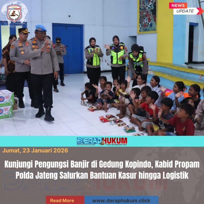 Pekalongan, Jawa Tengah | DerapHukum.click | Polres Pekalongan – Polda Jateng – Kepedulian terhadap warga terdampak bencana ditunjukkan oleh jajaran Polda Jawa Tengah. Di sela agenda kunjungannya di wilayah hukum Polres Pekalongan, Kabid Propam Polda Jateng Kombes Pol. Saiful Anwar, S.Sos., S.I.K., M.H., menyempatkan diri menyambangi warga Desa Mulyorejo yang kini mengungsi di Gedung Kopindo, Kecamatan Wiradesa, Kamis (22/01/2026) sore.