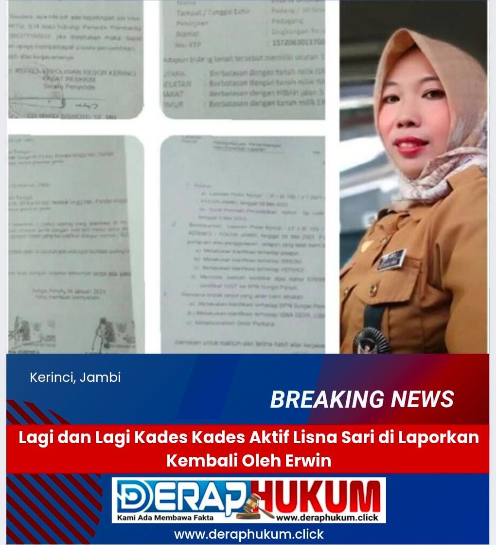 KERINCI | Deraphukum.click | Kepala Desa Tanjung Syam, Lisna Sari, kembali menjadi sorotan setelah dilaporkan atas dugaan penipuan terkait sengketa tanah. Kali ini, Lisna Sari bersama rekan-rekannya diduga melanggar perjanjian bermaterai yang menyatakan akan mengembalikan hak Erwin Wilanda sebesar Rp75 juta. Namun, hingga kini, janji tersebut belum ditepati.