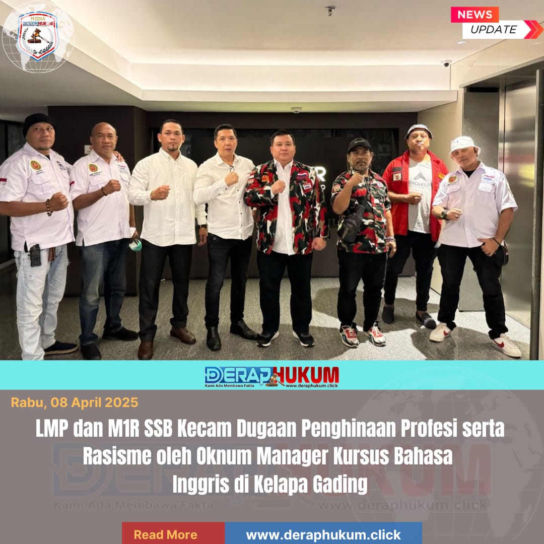 JAKARTA, | Deraphukum.click | Markas Besar Laskar Merah Putih (LMP) bersama Ormas Maluku Satu Rasa Salam Sarane Bersatu (M1R SSB) menyatakan sikap tegas terkait dugaan penghinaan profesi advokat dan tindakan rasisme yang dilakukan oleh oknum pimpinan lembaga kursus bahasa Inggris berinisial ‘SE’ di kawasan Kelapa Gading, Jakarta Utara.