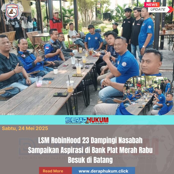 BATANG, | DerapHukum.Click | Lembaga Swadaya Masyarakat (LSM) RobinHood 23 akan melakukan aksi penyampaian aspirasi bersama puluhan nasabah orang pada Rabu, 28 Mei 2025. Aksi ini rencananya digelar di depan Bank plat merah di Batang dengan jumlah peserta sekitar 80 orang.
