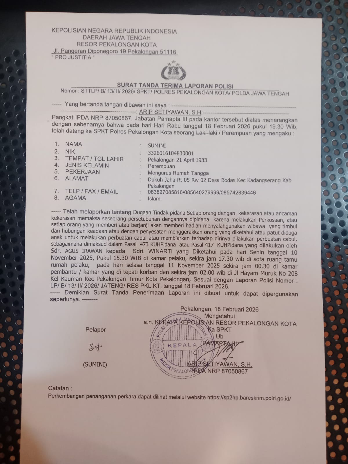 Sesuai Surat Tanda Terima Laporan Polisi ( STTLP) Polres Pekalongan Kota tanggal 18 Nopember 2026 No. STTLP/B/13/II/2026/SPKT/Polres Pekalongan Kota/ Polda Jateng dijelaskan bahwa telah terjadi dugaan tindak pidana pencabulan dan persetubuhan dengan kekerasan yang dilakukan oleh Ag. In waga Kauman Kota Pekalongan terhadap Wi(15) warga Desa Bodas Kandang Serang Kabupaten Pekalongan.