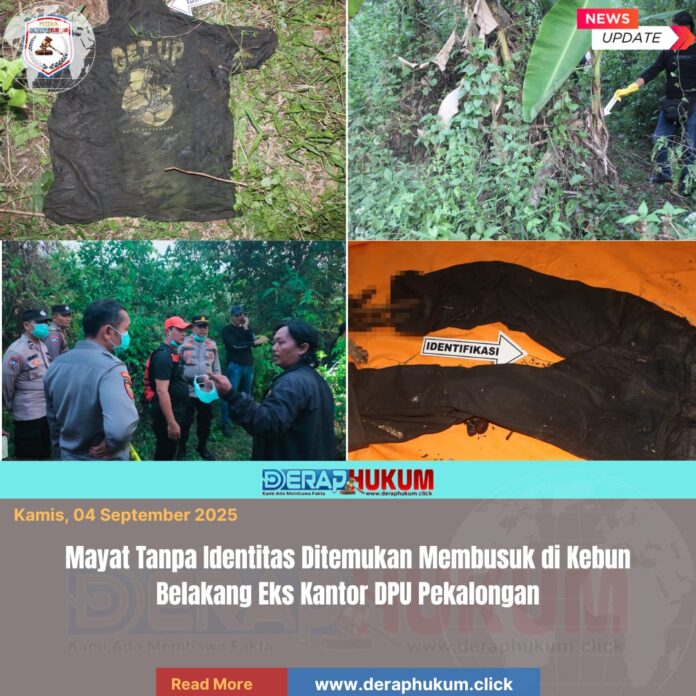 Pekalongan,Jawa Tengah | Deraphukum.click | Polres Pekalongan – Polda Jateng – Sesosok mayat tanpa identitas ditemukan dalam kondisi telah menjadi kerangka di sebuah kebun yang berada di belakang bangunan kosong, bekas Kantor DPU Kabupaten Pekalongan, tepatnya di Dukuh Sibedug, Desa Kebonagung, Kecamatan Kajen, Kabupaten Pekalongan, pada Rabu (03/09/2025) sore.