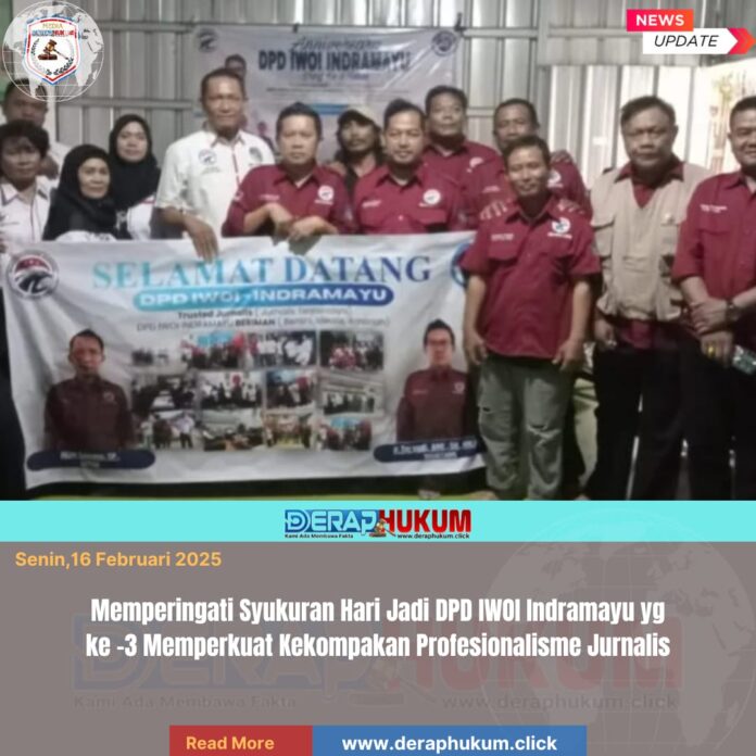 Indramayu,Jawa Barat | Deraphukum.click | Suasana penuh kebahagiaan dan keakraban mewarnai acara syukuran Hari Ulang Tahun (HUT) ke-3 DPD Ikatan Wartawan Online Indonesia (IWOI) Indramayu. Kegiatan ini menjadi ungkapan rasa syukur atas panjang umur, kesehatan, serta kekuatan yang senantiasa dianugerahkan Allah SWT, sekaligus doa agar seluruh insan pers yang tergabung tetap berada dalam lindungan-Nya saat menjalankan tugas sebagai jurnalis terpercaya.