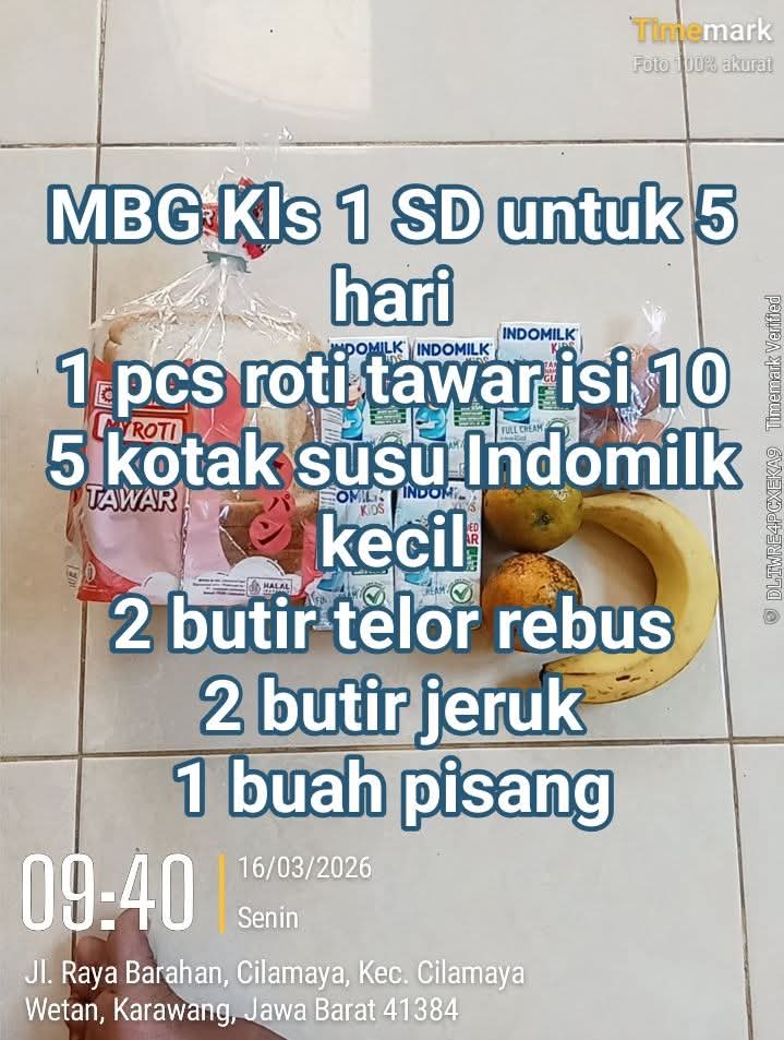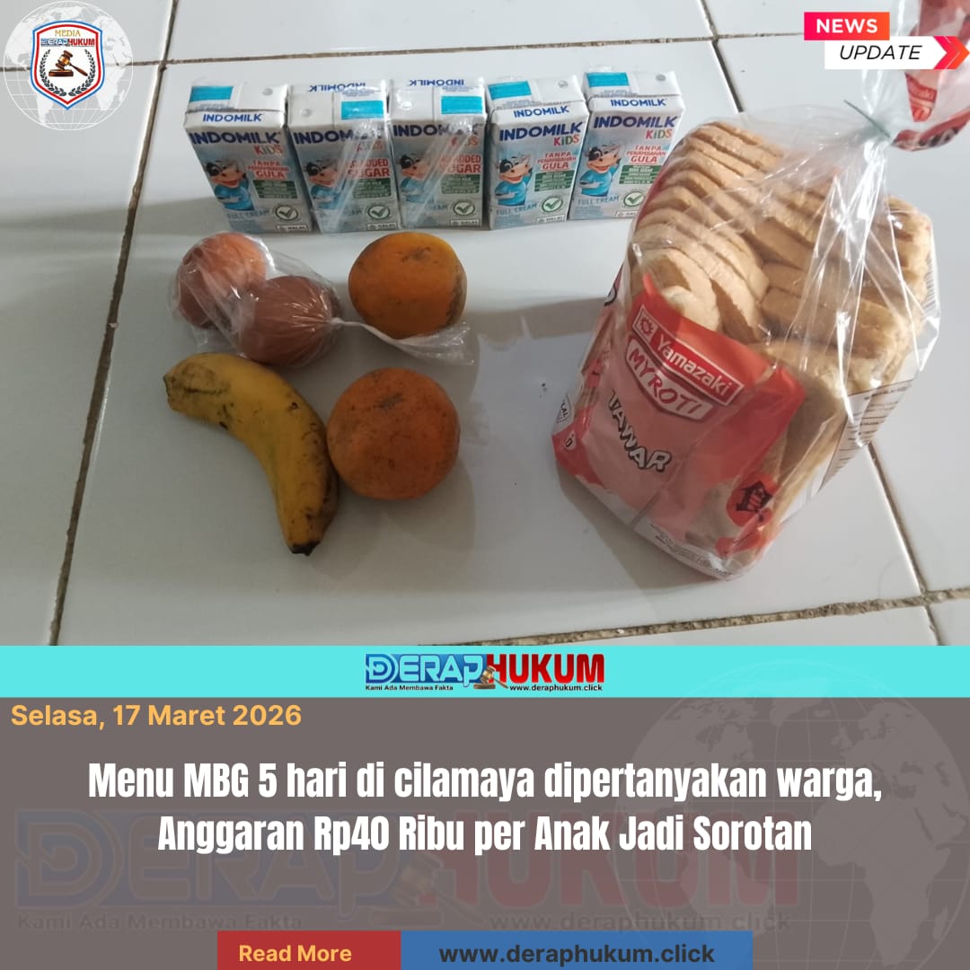 Karawang, Jawab Barat | Deraphukum.click | Program Makan Bergizi Gratis (MBG) yang disalurkan melalui dapur MBG di Desa Cilamaya, Kecamatan Cilamaya Wetan, Kabupaten Karawang, mulai menjadi sorotan warga. Pasalnya, menu makanan yang dibagikan untuk siswa TK, PAUD hingga SD kelas 1, 2 dan 3 pada periode 16 Maret sampai 20 Maret 2026 dinilai tidak sebanding dengan nilai anggaran yang disebutkan.
