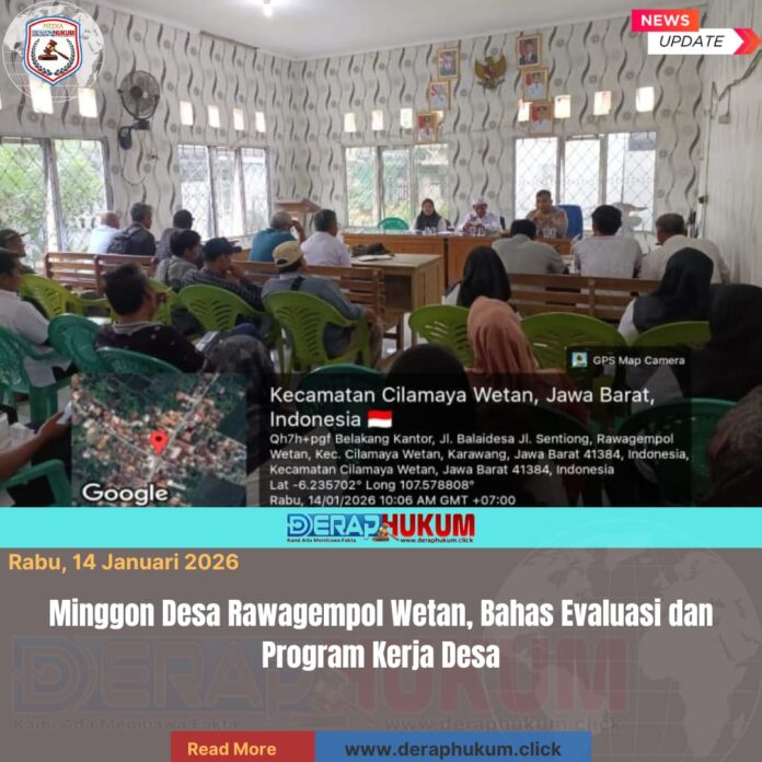 Pemerintah Desa Rawagempol Wetan, Kecamatan Cilamaya, Kabupaten Karawang, melaksanakan kegiatan Minggon Desa pada Rabu, 14 Januari 2026. Kegiatan ini berlangsung di kantor Desa Rawagempol Wetan dan dihadiri langsung oleh Kepala Desa Rawagempol Wetan, Bapak H. Udin AG.