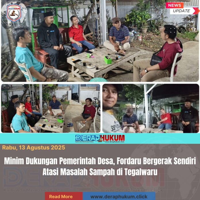 Karawang, Jawa Barat | Deraphukum.click | Tegalwaru, Di tengah persoalan sampah yang kian menumpuk di lingkungan Desa Tegalwaru, Kecamatan Cilamaya Wetan, inisiatif pemuda lokal patut diapresiasi. Forum Pemuda Dusun Tegalwaru (Fordaru) bersama Media DerapHukum Biro Karawang menggelar silaturahmi dan sosialisasi pengelolaan sampah pada Rabu malam (13/8/2025) pukul 20.00 WIB.