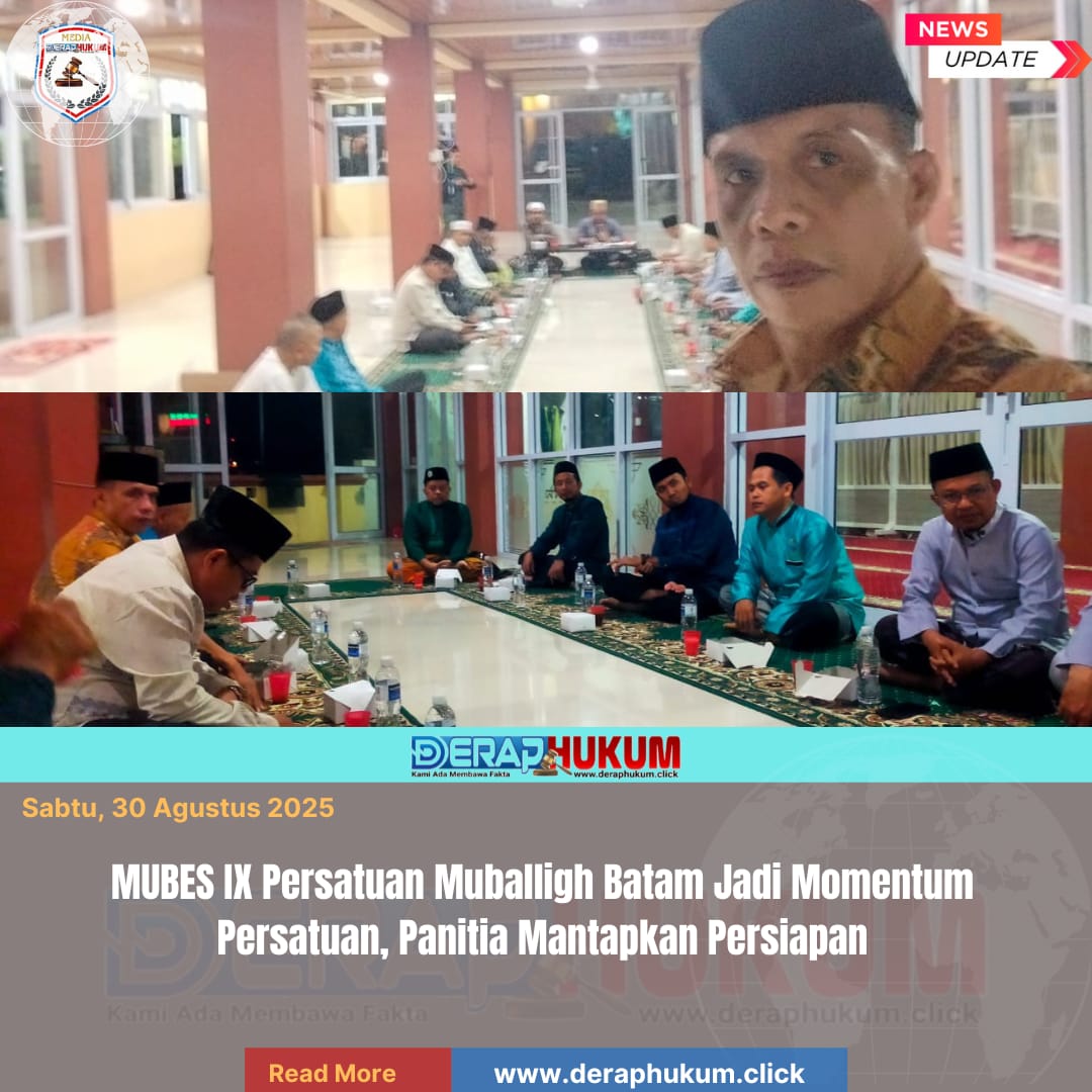 Batam, | Deraphukum.click | Persiapan Musyawarah Besar (MUBES) IX Persatuan Muballigh Batam (PMB) semakin intensif. Agenda akbar yang akan digelar pada Ahad, 7 September 2025, di Aula Yayasan Ibnu Sina Batam pukul 08.00 WIB ini akan menjadi ajang pemilihan Ketua PMB Kota Batam sekaligus momentum memperkuat ukhuwah Islamiyah.
