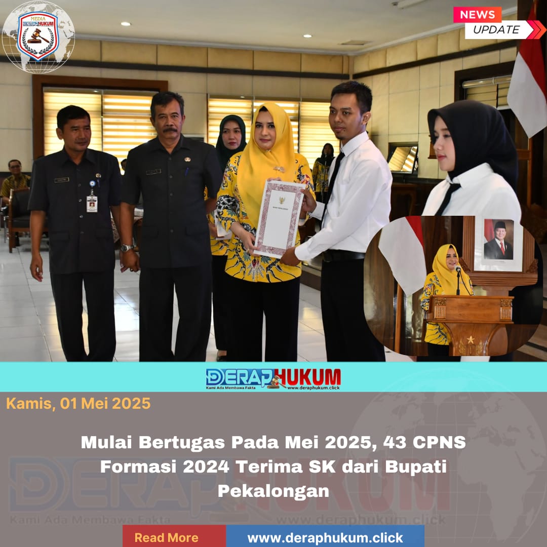 Pekalongan,Jawa Tengah | DerapHukum.Click | Bupati Pekalongan Fadia Arafiq secara resmi menyerahkan Surat Keputusan (SK) Pengangkatan kepada sebanyak 43 Calon Pegawai Negeri Sipil (CPNS) Formasi Tahun 2024 Kabupaten Pekalongan dalam acara yang berlangsung di Aula Lantai I Setda Kabupaten Pekalongan, Rabu (30/04/2025).