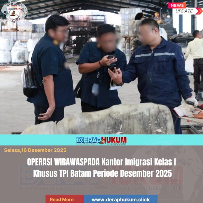 Batam, | Deraphukum.click | Selasa, 16 Desember 2025 — Kantor Imigrasi Kelas I Khusus TPI Batam melaksanakan Operasi Wirawaspada pada tanggal 9 hingga 12 Desember 2025. Kegiatan ini merupakan operasi pengawasan keimigrasian yang dilaksanakan secara serentak di seluruh wilayah Indonesia atas instruksi Direktorat Jenderal Imigrasi. Operasi ini bertujuan sebagai langkah preventif dalam mencegah pelanggaran keimigrasian serta sebagai bagian dari upaya penegakan hukum guna menjaga stabilitas dan keamanan negara.