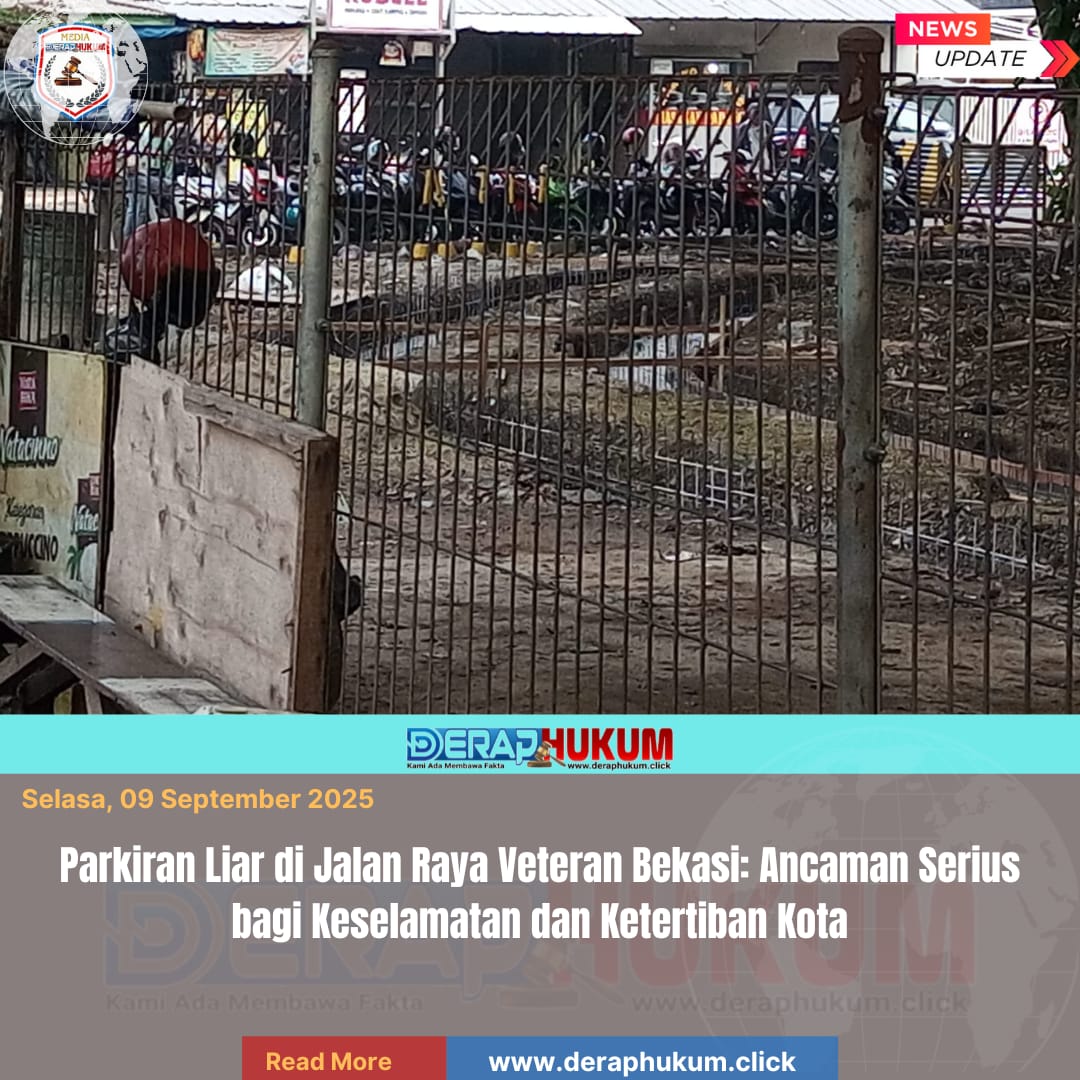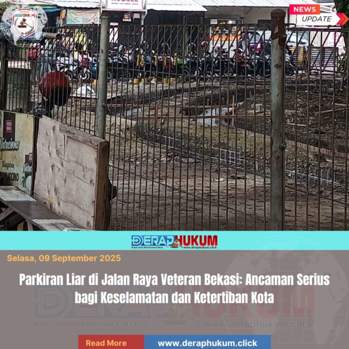 Kota Bekasi, | Deraphukum.click | Selasa, 09 September 2025 — Jalan Raya Veteran RT 05/06, Kelurahan Marga Jaya, Bekasi, kini menjadi sorotan akibat maraknya praktik parkiran liar yang tidak berizin dan dikelola oleh oknum yang memanfaatkan lahan jalan umum secara ilegal. Kondisi ini bukan hanya mengganggu kelancaran lalu lintas, tetapi juga sangat berisiko terhadap keselamatan warga dan pengguna jalan.