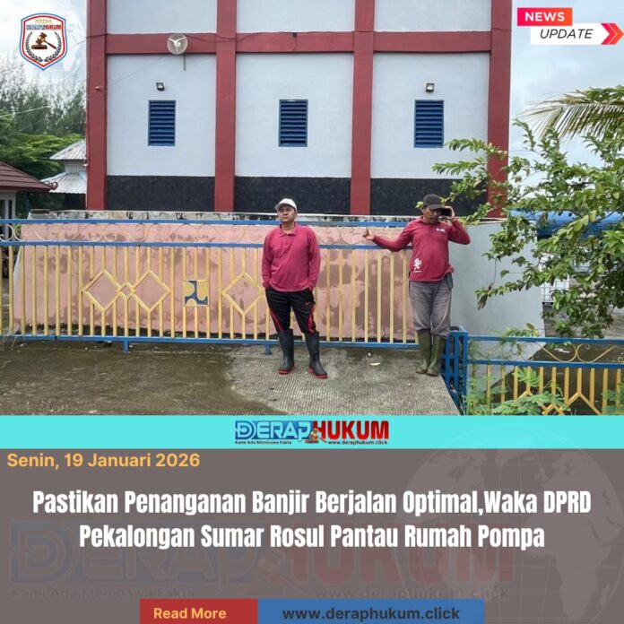 PEKALONGAN, Jawa Tengah | DerapHukum.click | Wakil Ketua DPRD Kabupaten Pekalongan,H. Sumar Rosul, S.IP., M. AP., turun langsung memantau penanganan banjir dengan meninjau sejumlah rumah pompa di wilayah terdampak, Minggu (18/1/2026). Kegiatan tersebut dilakukan untuk memastikan seluruh rumah pompa beroperasi secara optimal guna mempercepat surutnya banjir.