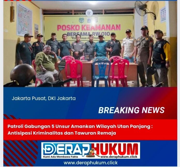 JAKARTA PUSAT | Deraphukum.click | 5 Januari 2025, Keamanan dan ketertiban lingkungan merupakan tanggung jawab bersama, bukan hanya milik aparat kepolisian tetapi juga seluruh elemen masyarakat yang peduli terhadap kenyamanan tempat tinggal. Hal ini dibuktikan melalui kolaborasi sinergis berbagai elemen masyarakat di Kelurahan Utan Panjang, Kecamatan Kemayoran, Jakarta Pusat, dengan melaksanakan patroli gabungan pada Sabtu malam (5/1).
