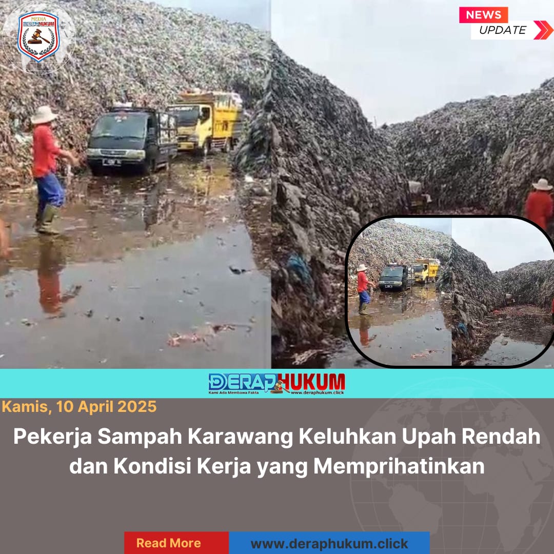 Karawang Jawa Barat | Deraphukum.click | Pekerja sampah di Kabupaten Karawang mengeluhkan rendahnya upah harian yang mereka terima, yaitu sebesar Rp80.000 per hari, meskipun harus bekerja sejak pagi hingga malam. Mereka mengaku kelelahan akibat antrean panjang di Tempat Pembuangan Akhir (TPA) Jalupang serta kondisi jalan menuju lokasi yang rusak dan dipenuhi tumpukan sampah.