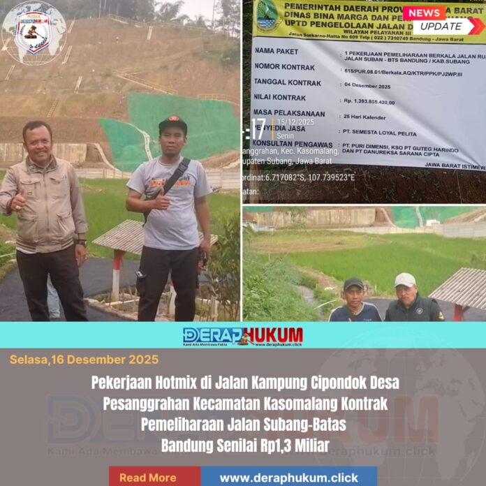 Proyek tersebut adalah Pekerjaan Pemeliharaan Berkala Jalan Ruas Jalan Suban – Batas Bandung / Kabupaten Subang, dengan nilai kontrak fantastis mencapai Rp1.393.855.420,00 alamat pekerjaan di kampung ci pondok RT/RW 04/02.