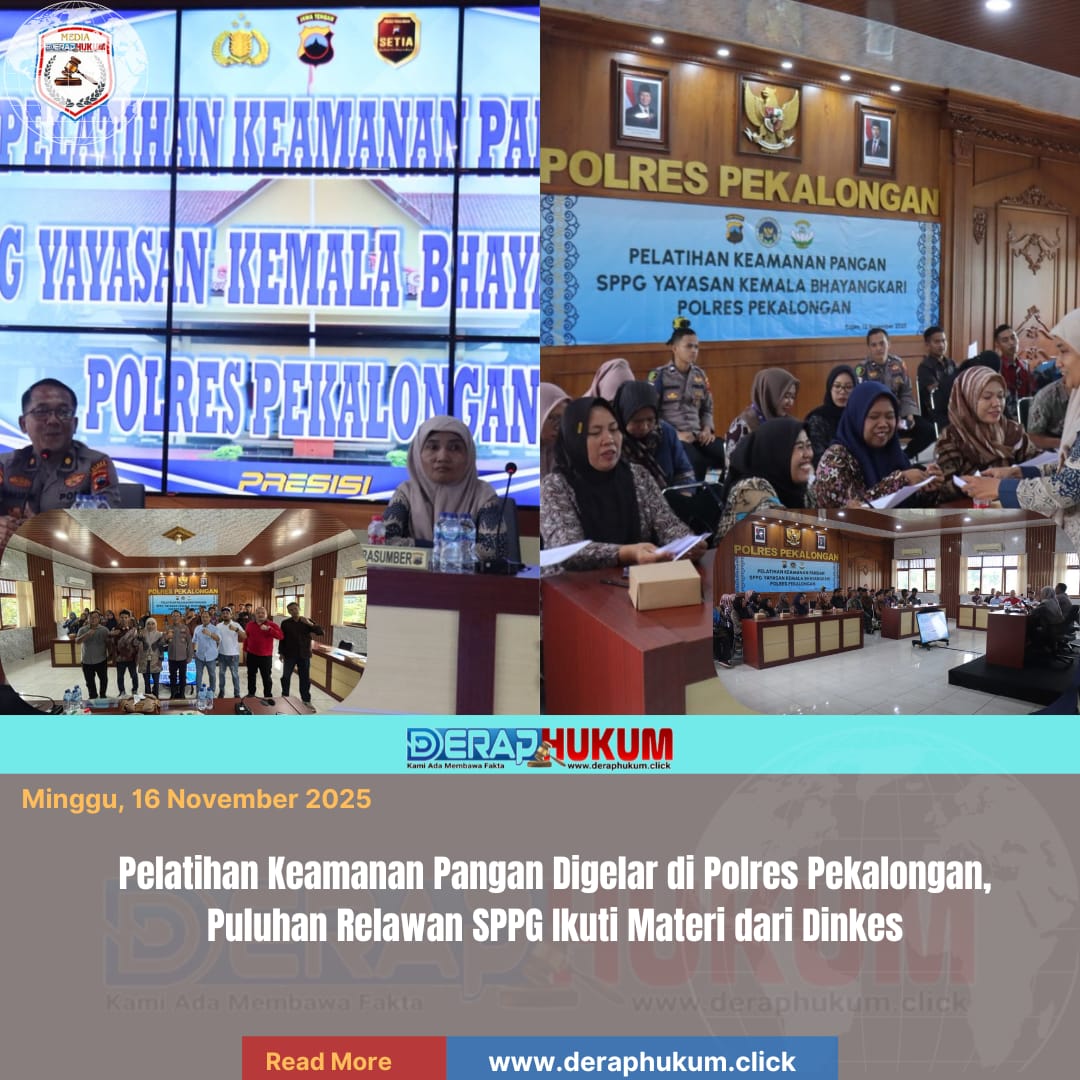 Pekalongan,Jawa Tengah | Deraphukum.click | Polres Pekalongan – Polda Jateng – Polres Pekalongan menggelar Pelatihan Keamanan Pangan yang diselenggarakan oleh Sie Dokkes Polres Pekalongan, Sabtu (15/11/2025). Kegiatan yang berlangsung di Aula Polres Pekalongan itu, diikuti oleh 30 calon Relawan SPPG Kajen.