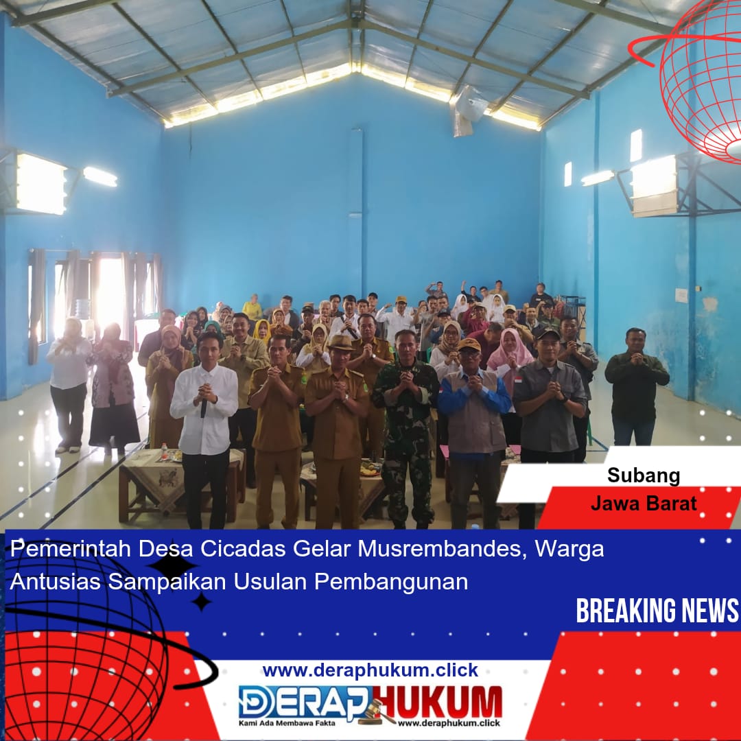 SUBANG | Deraphukum.click | – Pemerintah Desa (Pemdes) Cicadas menggelar Musyawarah Perencanaan Pembangunan Desa (Musrenbangdes) di Aula Gedung Olahraga (GOR) Desa Cicadas, Kecamatan Sagalaherang, Kabupaten Subang, Jawa Barat, pada Senin, 3 Februari 2025. Acara ini menjadi momentum penting bagi masyarakat dalam menyampaikan aspirasi dan kebutuhan pembangunan di wilayah mereka.