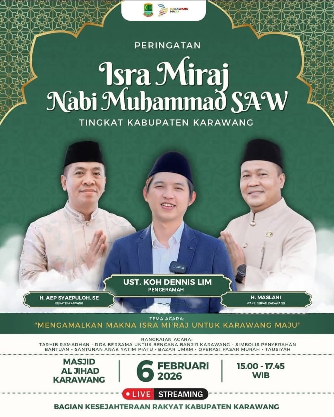 Kegiatan keagamaan ini dijadwalkan berlangsung mulai pukul 15.00 hingga 17.45 WIB dan menghadirkan Ustaz Koh Dennis Lim sebagai penceramah utama. Acara ini mengusung tema “Mengamalkan Makna Isra Mi’raj untuk Karawang Maju”, sebagai ajakan bagi masyarakat untuk meneladani nilai-nilai spiritual Isra Mi’raj dalam kehidupan sehari-hari dan pembangunan daerah.