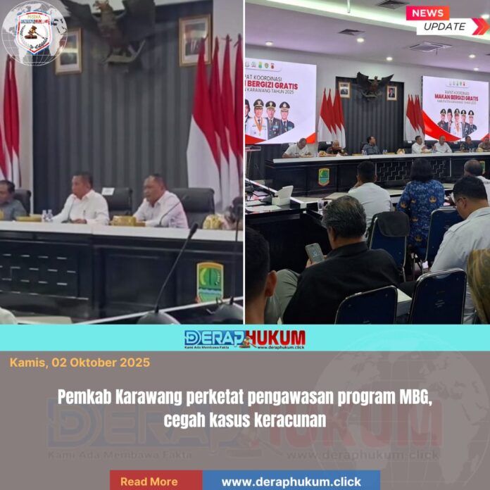 KARAWANG,jawa Barat | Deraphukum.click | Pemerintah Kabupaten (Pemkab) Karawang menggelar rapat koordinasi bersama unsur Musyawarah Pimpinan Daerah (Muspida) dan Tim SPPG pada Rabu (1/10/2025). Agenda ini membahas langkah mitigasi dalam pelaksanaan Program Makan Bergizi (MBG) guna mencegah potensi keracunan pangan serta memastikan kualitas dan keamanan makanan bagi anak-anak.