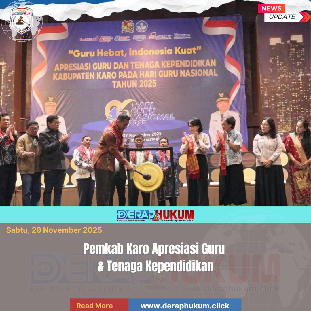 Pemerintah Kabupaten (Pemkab) Karo memberikan apresiasi kepada Guru dan Tenaga Kependidikan pada Hari Guru Nasional Tahun 2025, Acara ini menjadi momentum penting untuk memberikan penghargaan kepada para pendidik yang telah berkontribusi besar dalam peningkatan kualitas pendidikan di Kabupaten Karo, bertempat di Theater Mikie Holiday Berastagi, pada Kamis (27/11/2025).