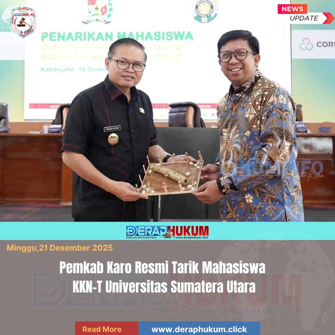 Pemerintah Kabupaten (Pemkab) Karo melaksanakan acara penarikan Mahasiswa peserta Program Kuliah Kerja Nyata Tematik Merdeka Belajar Kampus Merdeka (KKN-T MBKM) Universitas Sumatera Utara (USU) Semester Ganjil Tahun Akademik 2025/2026 yang berlangsung di Aula Kantor Bupati Karo, Kamis (18/12/2025).