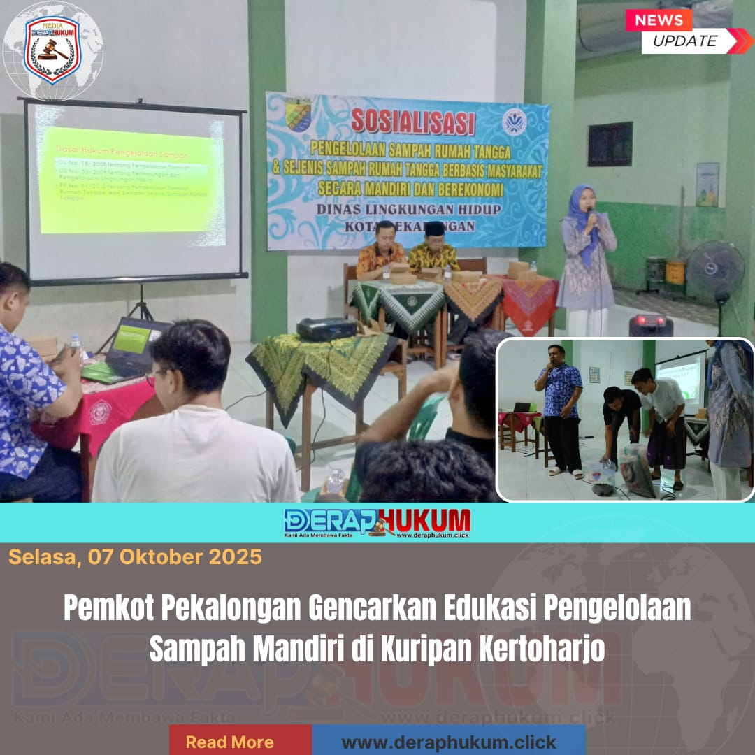 PEKALONGAN, Jawa Tengah | DerapHukum.click | 7 Oktober 2025 Pemerintah Kota Pekalongan melalui Dinas Lingkungan Hidup (DLH) terus menggencarkan edukasi pengelolaan sampah berbasis masyarakat di tengah kondisi darurat sampah yang masih berlangsung. Salah satu upaya tersebut diwujudkan melalui kegiatan sosialisasi pengelolaan sampah rumah tangga di Kelurahan Kuripan Kertoharjo pada 4 dan 5 Oktober 2025.