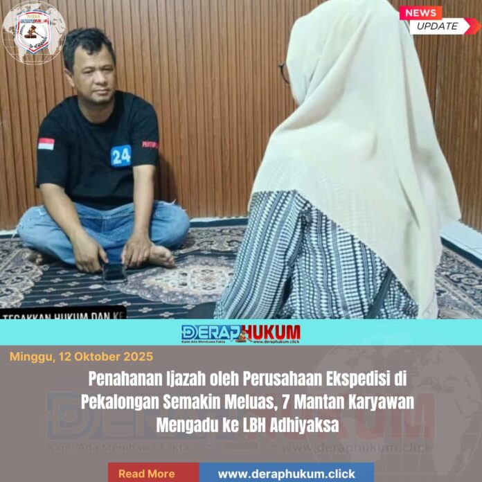 Kota Pekalongan, | Deraphukum.click | Kasus dugaan penahanan ijazah oleh sebuah perusahaan jasa ekspedisi di Kota Pekalongan semakin meluas. Lembaga Bantuan Hukum (LBH) Adhiyaksa menyebut, hingga Sabtu (11/10/2025), sudah ada tujuh mantan karyawan yang mengadu dengan masalah serupa.