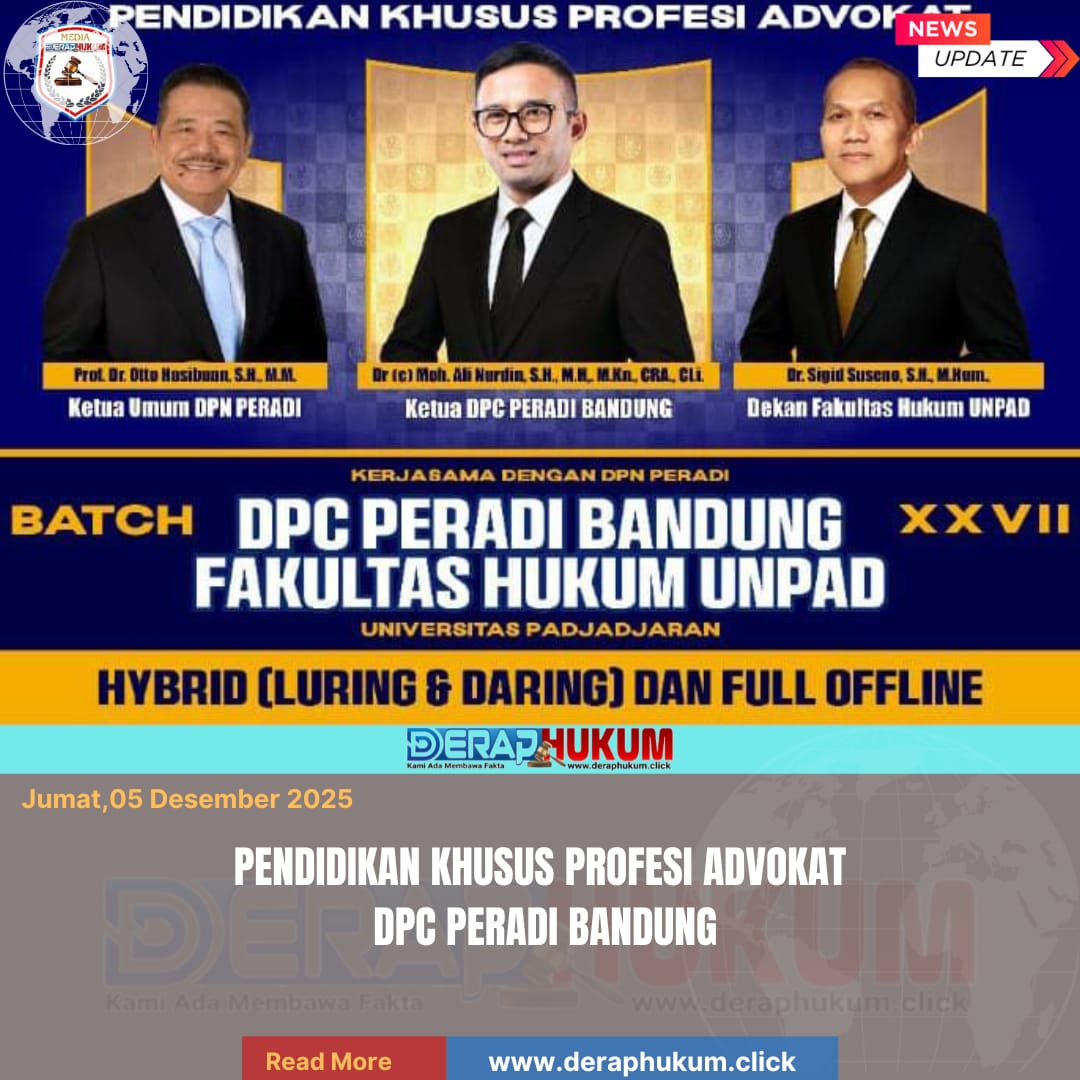 | Deraphukum.click | Informasi bagi Sarjana Hukum yang mau menjadi Advokat, berdasarkan Undang – undang No. 18 Tahun 2003 Tentang Advokat, DPN PERADI – DPC PERADI Bandung Kerjasama dengan Fakultas Hukum Universitas Padjadjaran (FH UNPAD) Bandung melaksanakan PENDIDIKAN KHUSUS PROFESI ADVOKAT (PKPA) dengan Metode HYBRID (Daring & Luring) dan Full Offline dengan Pendaftaran sebagai berikut :