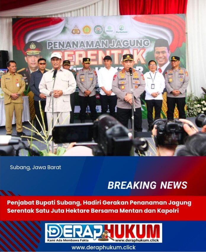 SUBANG, JABAR | Deraphukum.click | – Penjabat Bupati Subang, Drs. M. Ade Afriandi, MT., hadir secara langsung dalam acara Gerakan Penanaman Jagung Serentak 1 Juta Hektare, bertempat di Desa Karangmukti Kecamatan Cipeundeuy, Selasa (21/01/2025).