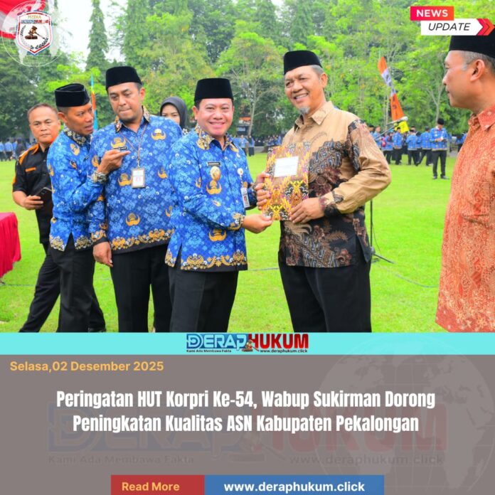 KAJEN, | Deraphukum.click | Wakil Bupati (Wabup) Pekalongan, Sukirman, mengajak seluruh Aparatur Sipil Negara (ASN) di Kabupaten Pekalongan untuk terus meningkatkan kualitas, keterampilan, dan profesionalisme dalam memberikan pelayanan kepada masyarakat. Hal tersebut disampaikannya usai mewakili Bupati Pekalongan memimpin Upacara Peringatan Hari Ulang Tahun (HUT) Korpri ke-54 Tahun 2025 yang digelar di Lapangan Belakang Kantor Setda Kabupaten Pekalongan, Senin (1/12/2025).
