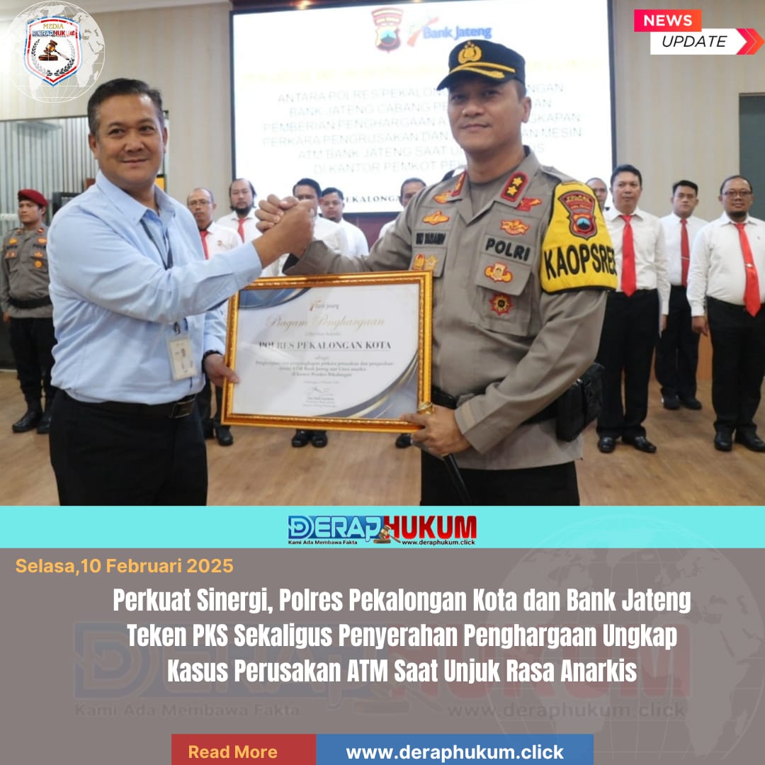 Pekalongan Kota, | Deraphukum.click | Polres Pekalongan Kota – Polda Jateng – Polres Pekalongan Kota mendapatkan penghargaan dari PT Bank Jateng Cabang Pekalongan atas keberhasilan pengungkapan kasus pengrusakan dan penjarahan mesin ATM Bank Jateng saat unjuk rasa anarkis di Kantor Pemkot Pekalongan Agustus 2025 lalu.